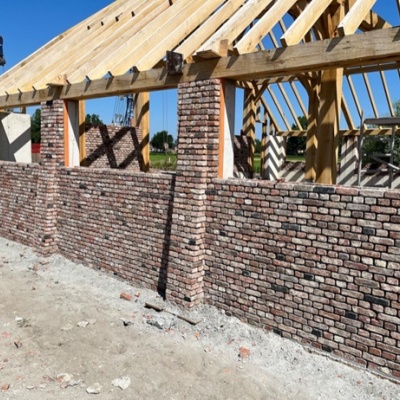 Op de foto is een realisatie te zien met deze stenen. De muur is hier nog niet afgespoten met water en ook nog niet gevoegd.